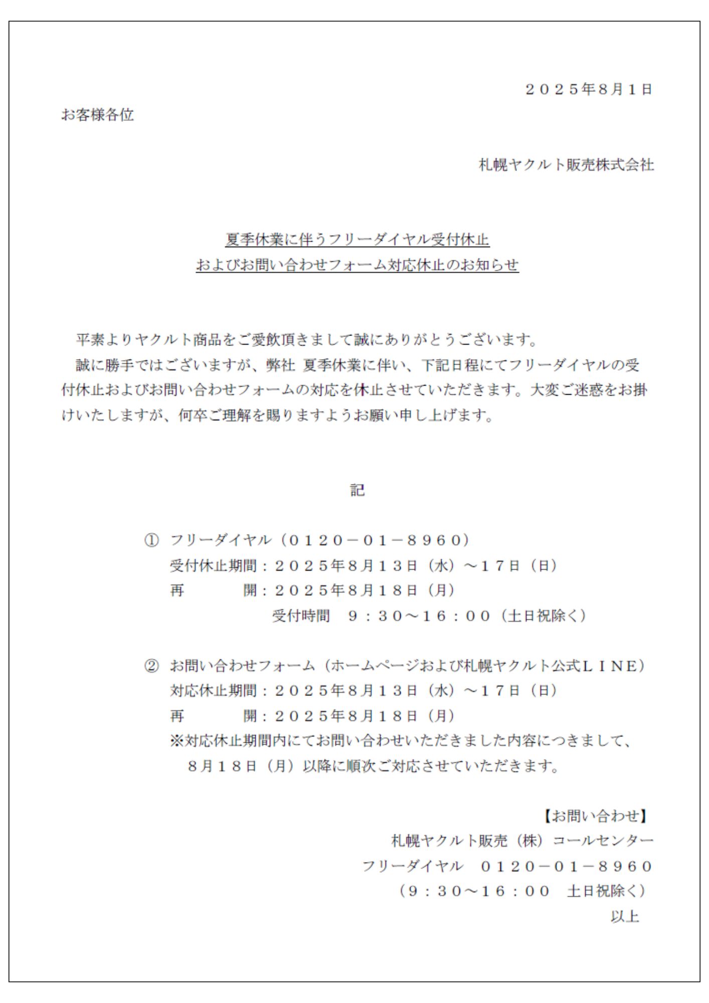 INFORMATIONインフォメーション 提供サービス 宅配サービス ロッカー受取りサービス 企業向けサービス エステサービス 美容相談 健康教室・出前授業 商品情報 乳製品 化粧品 会社案内 事業指針 行動指針 企業情報 沿革 事務所一覧 部門紹介 センター一覧 健康経営 採用情報 ヤクルトレディ募集 新卒社員募集 Q&A 商品提供サービス エステ・美容相談 健康教室・出前授業 お問い合わせ TOP インフォメーション 【総】2025年度+夏季休暇(お盆)期間の各種受付休止につきまして (2).pdf (2) 【総】2025年度+夏季休暇(お盆)期間の各種受付休止につきまして (2).pdf (2) 2025.07.22 戻る 次へ