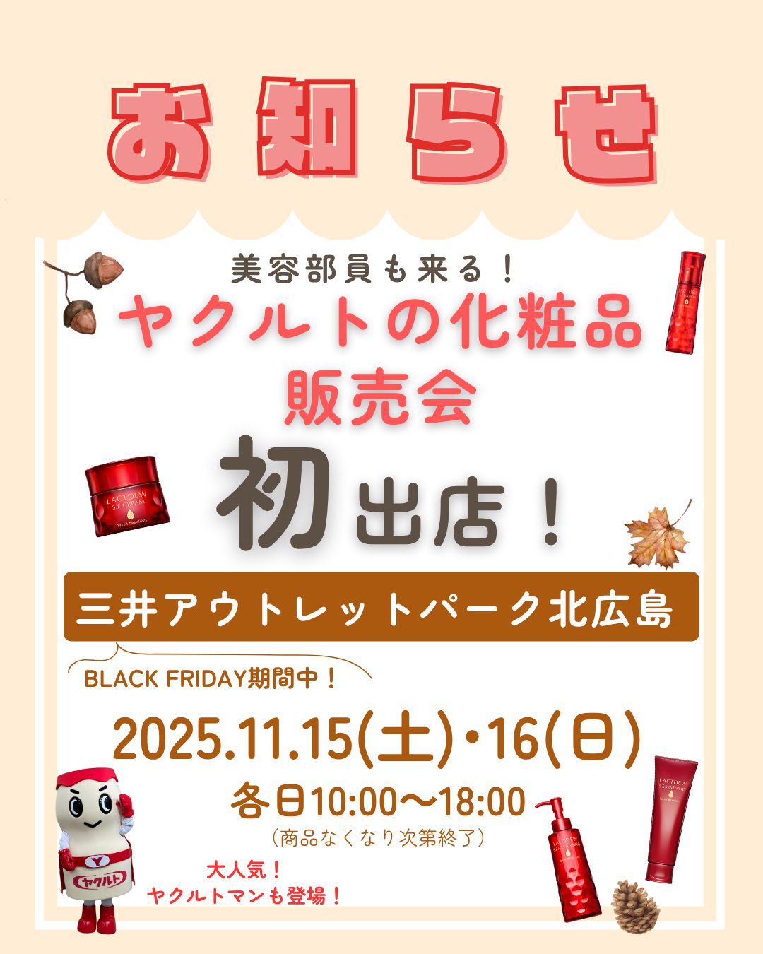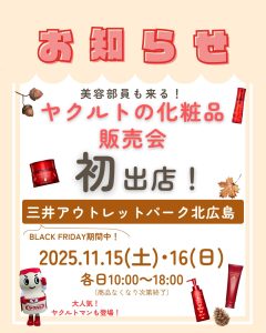 INFORMATIONインフォメーション 提供サービス 宅配サービス ロッカー受取りサービス 企業向けサービス エステサービス 美容相談 健康教室・出前授業 商品情報 乳製品 化粧品 会社案内 事業指針 行動指針 企業情報 沿革 事務所一覧 部門紹介 センター一覧 健康経営 採用情報 ヤクルトレディ募集 新卒社員募集 Q&A 商品提供サービス エステ・美容相談 健康教室・出前授業 お問い合わせ TOP インフォメーション 2025.11.15.16三井アウトレットパークイベント (1) 2025.11.15.16三井アウトレットパークイベント (1) 2025.11.12 戻る 次へ